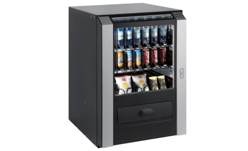 Ce type de distributeur un distributeur de boissons + Snack avec la possibilité d’avoir 2 choix de gâteau +4 choix de barre chocolatée et 14 choix de boissons fraiches. Ce distributeur est esclave d’une machine à café positionné au-dessus de celui-ci. (cela signifie, que notre distributeur doit être automatiquement lié à une machine à boisson chaude.)